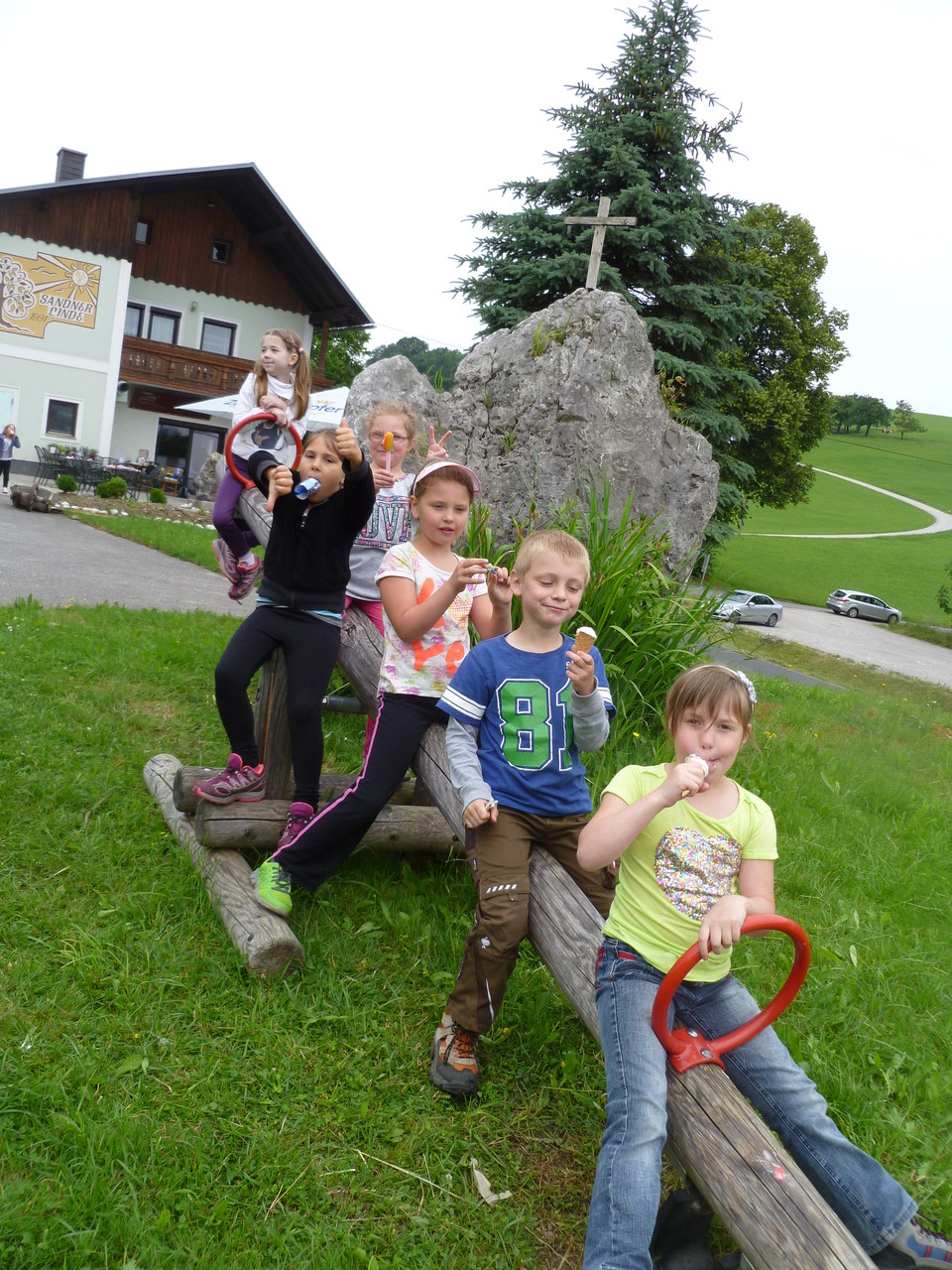 betrachteten wir am Wanderweg die neuen Kreuzwegbilder. Abwechslungsreich führte uns der Weg durch Wälder, über Brücken und Wiesen zum Ziel. Nach der Jause genossen wir unser Eis am Spielplatz.